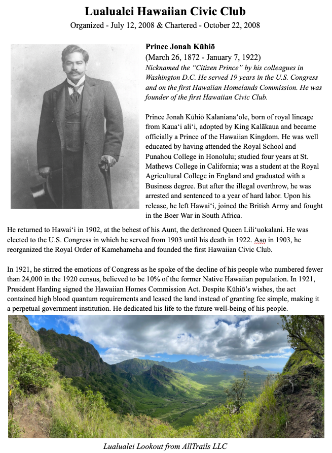 We are the Lualualei Hawaiian Civic Club based in Waiʻanae, Oʻahu and we are part of the Waiʻanae Moku of the Association of Hawaiian Civic Clubs.